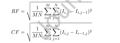 - 空间频率(SF):用于衡量图像中的整体活跃度。它通过行频率(RF)和列频率(CF)来表示 [182]。期望具有高空间频率值的融合图像。使用以下公式计算。