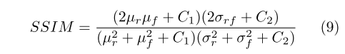 - 结构相似性指数度量(SSIM):它测量参考图像和融合图像之间的结构相似性。人类视觉系统对图像的结构内容更敏感,而融合影像中的结构细节损失能反映融合性能。该度量的范围是[-1,1],1表示相同的图像[86, 62]。使用以下公式计算。