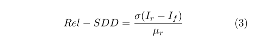 - 相对标准差差值(Rel-SDD):它是参考和融合多光谱波段之间差值的标准差,除以参考多光谱波段的均值[153]。其理想值为0,使用以下公式计算。