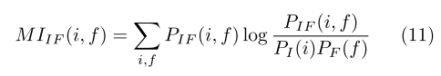 其中 \(I\) 和 \(F\) 是分别表示输入和融合图像的随机变量,其概率分布为 \(P_{I}(i)\) 和 \(P_{F}(f)\),而 \(P_{IF}(i,f)\) 是联合概率分布。