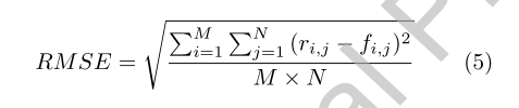 - 均方根误差(RMSE):它是参考图像和融合图像之间的均方根差[153, 105]。参考数据集 \(r\) 和融合数据集 \(f\) 之间的RMSE由以下公式给出。