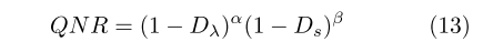 - 无参考质量(QNR)指数:在这种方法中,根据融合图像和源图像上计算的质量指数计算空间失真指数和光谱失真指数。将这两个指数各自的补数相乘,得到整体QNR指数。它测量融合图像中的光谱和空间失真。期望具有高的QNR值[6],趋向于1。以下公式给出QNR的值。