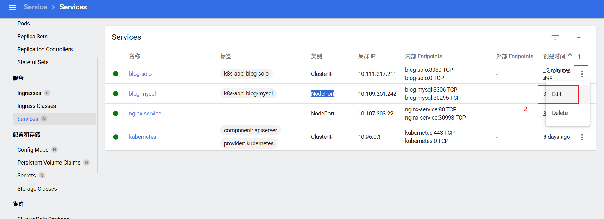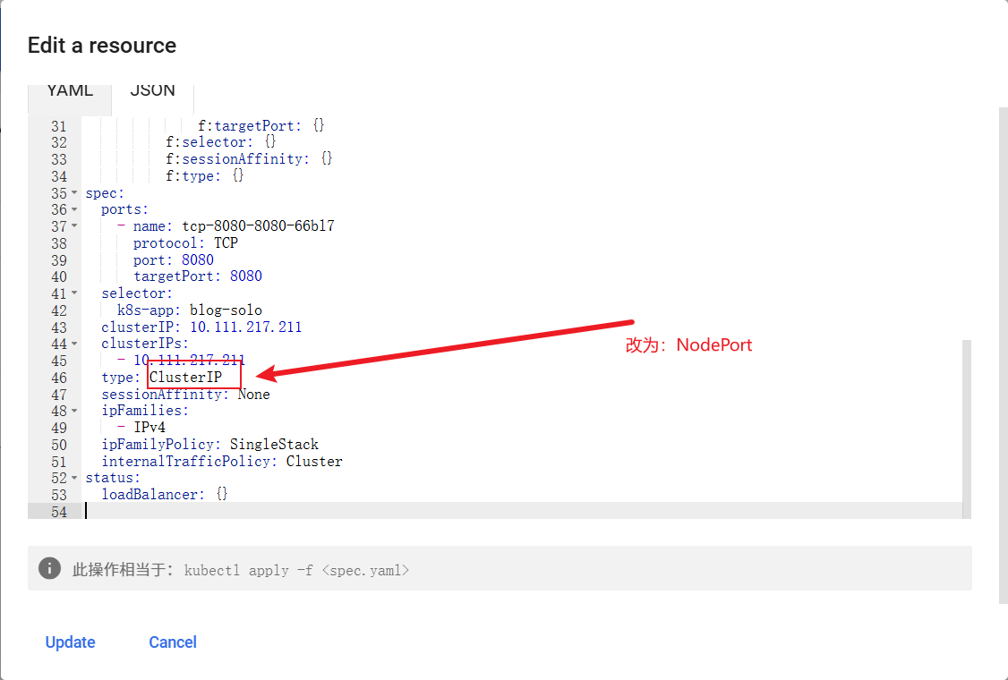 我们可以看到,当前service的类型是ClusterIP,因为咱们是单机部署的k8s,我们暂时先改为NodePort,这样k8s就会给咱们生成一个可以访问的端口号了