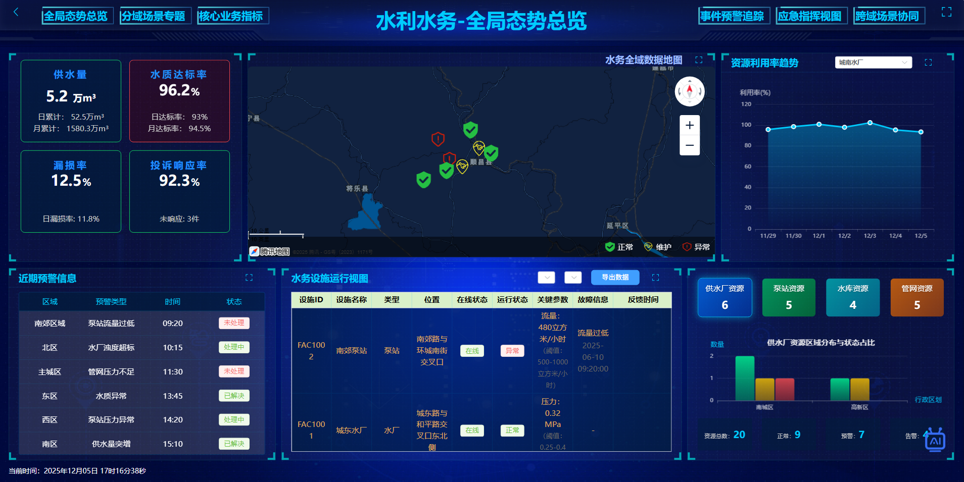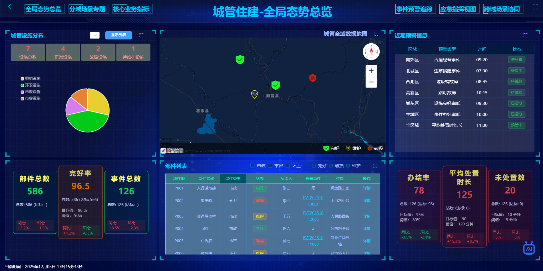 :全域数据地图、核心指标(事件总数 / 处置率 / 预警数)、设施分布;