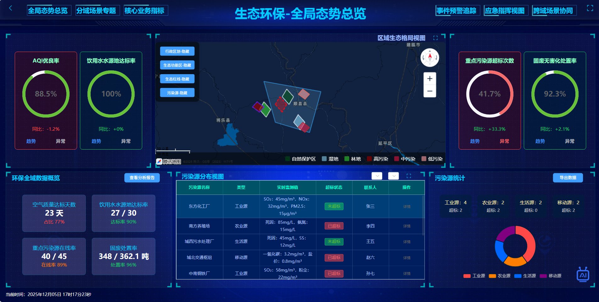 | 生态环保 | 空气质量监测(PM2.5/PM10)、水环境质量、噪声污染、固废危废追踪 |
