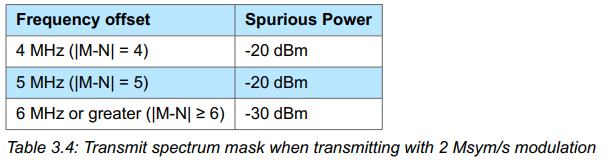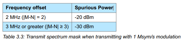 | RFPHY/TRM/BV-08-C [In-band emissions at 2 Ms/s] | PTX ≤ -20 dBm for (fTX 4 MHz) PTX ≤ -20 dBm for (fTX 5 MHz) PTX ≤ -30 dBm for (fTX [6 + n] MHz])* | fTX fTX - 1MHz, fTX + 1MHz fTX - 2MHz, fTX + 2MHz fTX - 3MHz, fTX + 3MHz | 2 Ms/s | MAX_TX_LENGTH_2M |