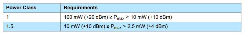 | RFPHY/TRM/BV-18-C [Output power, Class 1,1 Ms/s] | +10 dBm < PAVG ≤ +20 dBm | 1 Ms/s | MAX_TX_LENGTH |