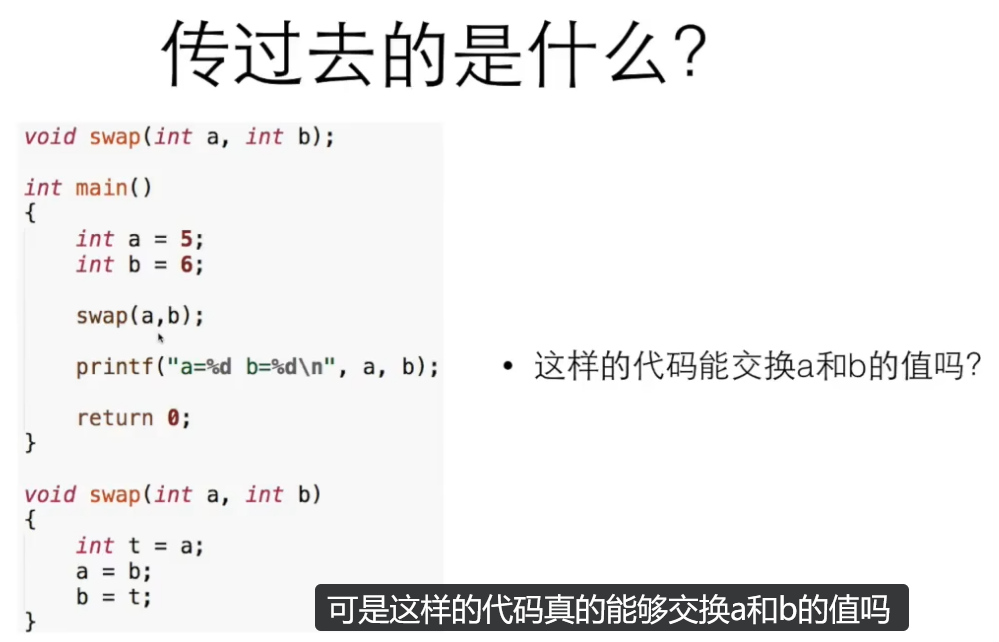 swap函数里交换的,只是复印件(形参 a、b) 的值,而main里的 "原件(实参 a、b)" 根本没被碰过。等swap执行完,复印件就被销毁了,所以main里打印的还是原来的 5 和 6