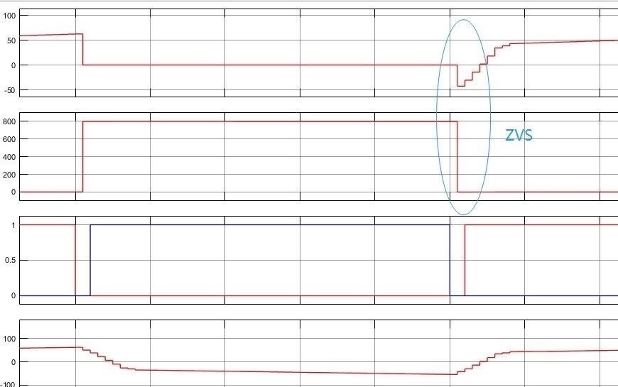 ZVS实现的关键在死区时间设置。每个桥臂的上下管驱动信号之间加了50ns的死区(图2黄色标注区域),这时候并联电容和变压器漏感开始秀操作。看这个开关管电压波形(图3),在驱动信号到来前Vds已经谐振到零,妥妥的零电压开通。不过要注意,轻载时可能达不到ZVS条件,这时候得在参数设计中留足谐振能量。