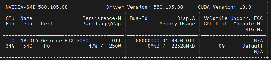 | 显卡 RTX 2080 Ti 22G | 驱动 NVIDIA-Linux-x86_64-580.105.08 |