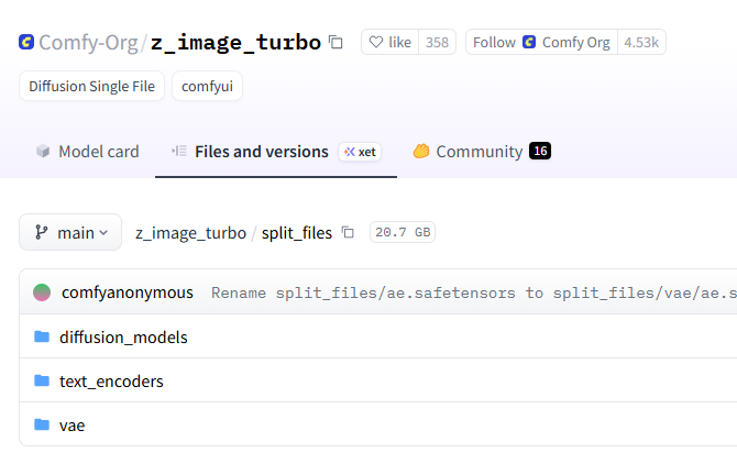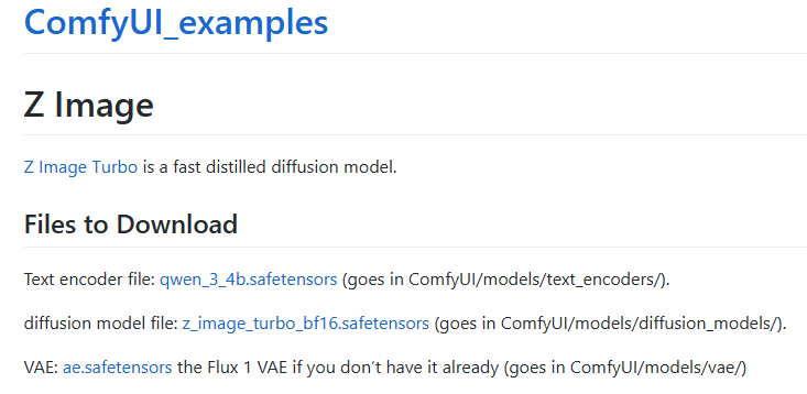 官方有一个 z-image的示例:https://comfyanonymous.github.io/ComfyUI_examples/z_image/ 按照它的介绍,下载三个模型文件: