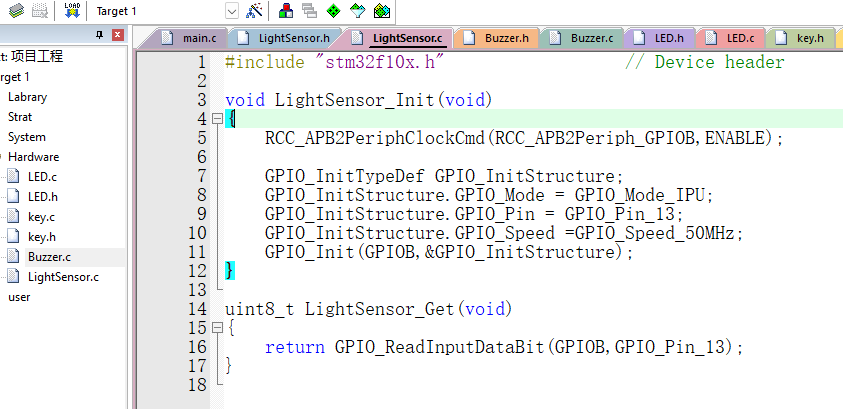 功能:初始化光线传感器对应的GPIO引脚,并读取传感器状态。