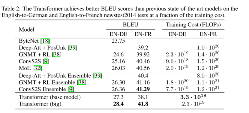 Transformer可以被训练地很快比起递归或者卷积架构。(Transformer can be trained significantly faster than architectures based on recurrent or convolutional layers.)在WMT 2014 English-to-German and WMT 2014 English-to-French translation任务中,达到了SOTA。在之前的任务中,超过了所有之前被报道的团体。