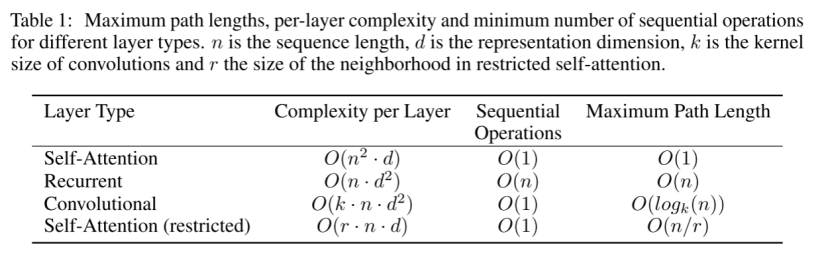 Table1:不同层类型的最大路径长度、每层复杂性和最小顺序操作数。n是序列长度,d是表示维,k是卷积的核大小,r是受限自关注中邻域的大小。