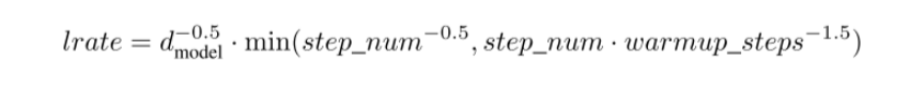 对于第一个warmup_steps线性地增加学习速率,并且此后以step_num的平方根的倒数成比例地减小它(就是step_num^(-0.5))。