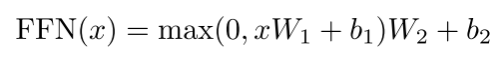 除了注意子层,编码器和解码器中的每一层都包含一个完全连接的前馈网络,该网络分别且相同地应用于每个位置。这由两个线性变换组成,其间有一个ReLU激活。