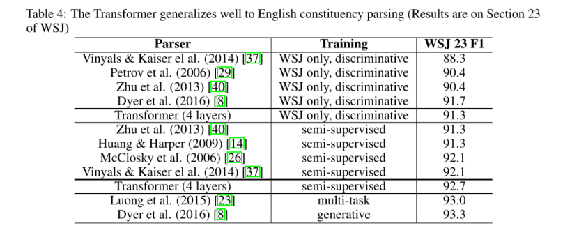 与RNN序列到序列模型[37]相比,Transformer的性能优于BerkeleyParser[29],即使只在WSJ训练集上训练40K个句子也是如此。