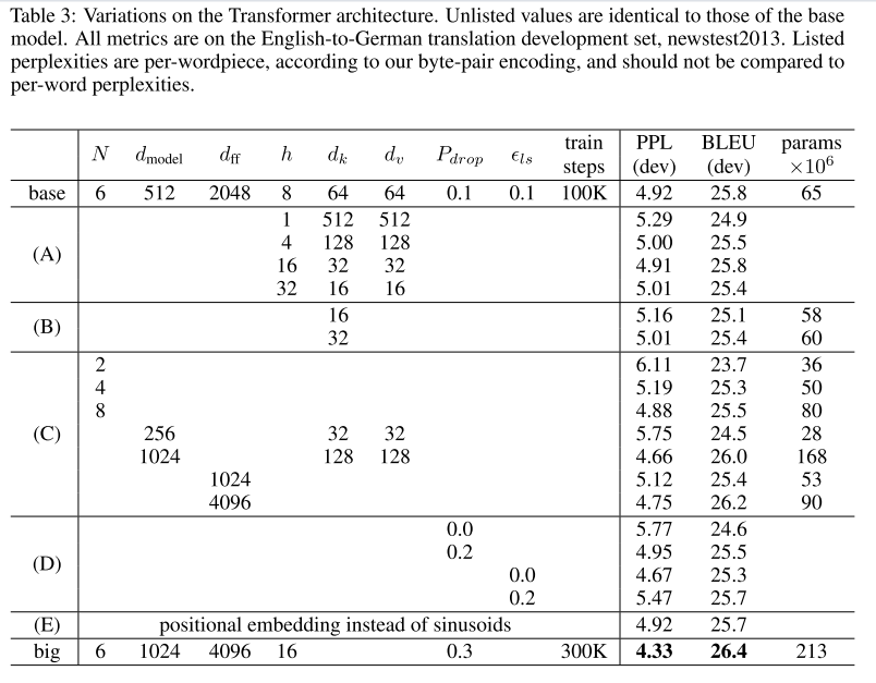 E:用学习的位置嵌入来替换我们的正弦位置编码replace our sinusoidal positional encoding with learned positional embeddings[9],并且观察到与基本模型几乎相同的结果