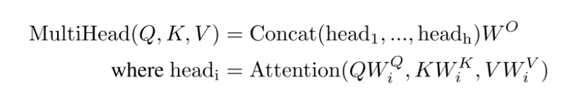 我们发现,使用不同的学习线性投影将查询、键和值分别线性投影到DK、DK和DV维度上h次是有益的,而不是使用dModel维键、值和查询执行单一的注意函数。然后,在这些查询、键和值的每个投影版本上,我们并行地执行注意力功能,从而产生dv维output value。它们被连接起来,并再次投影,产生最终的值,如图2所示。