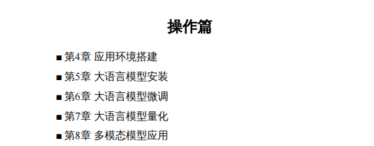 本篇分为5章,主要讲解大模型的实操环节,包括应用环 境的搭建,多种大模型的部署、微调与量化,囊括了大模 型的常用操作。
