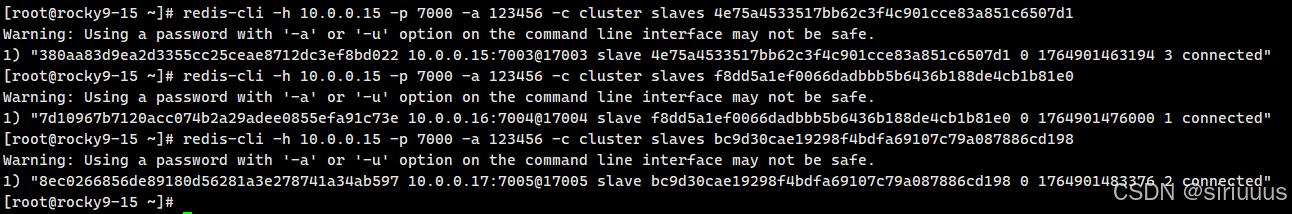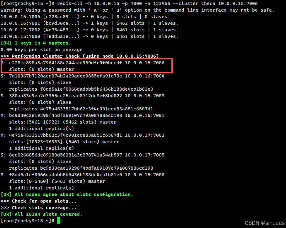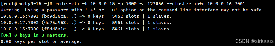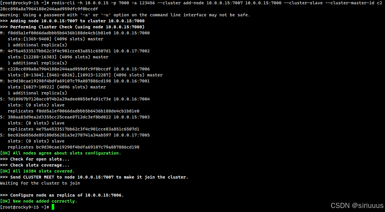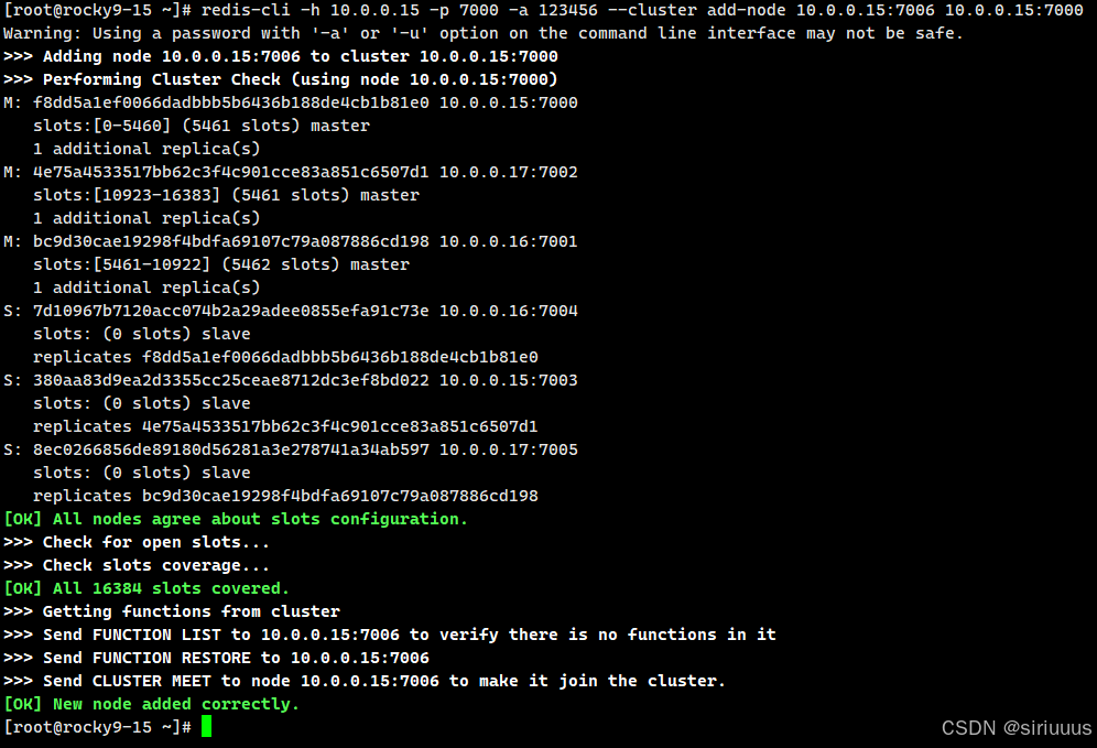 redis-cli -h 10.0.0.15 -p 7000 -a 123456 --cluster add-node 10.0.0.15:7006 10.0.0.15:7000