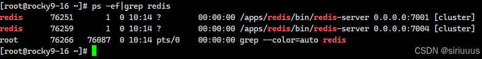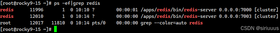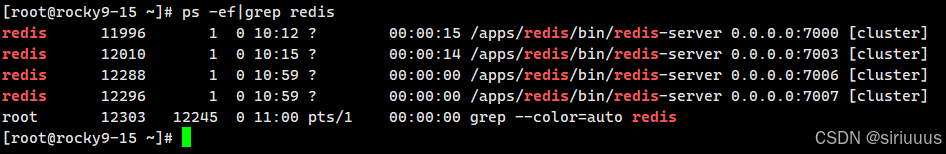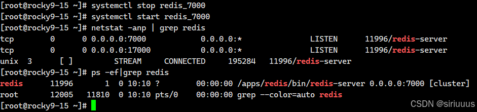 启动 7000 实例,观察端口及服务状态,可以看到进程后面有 [cluster] 标识
