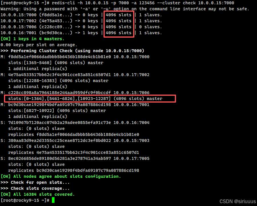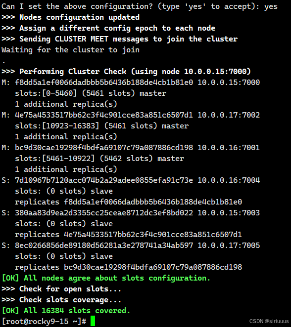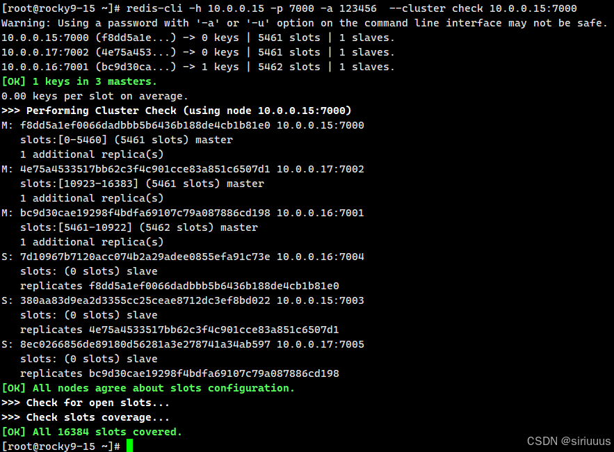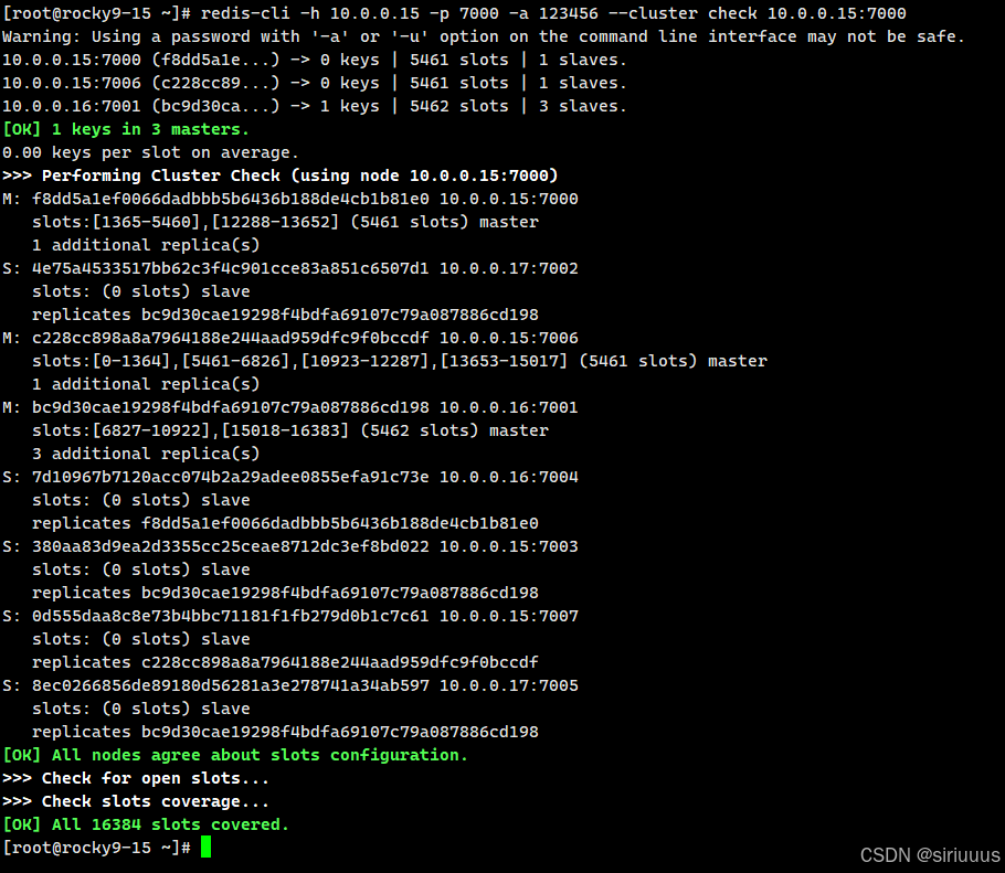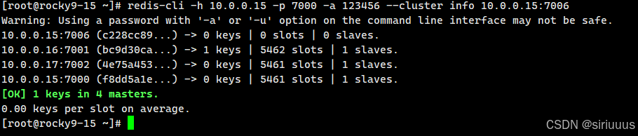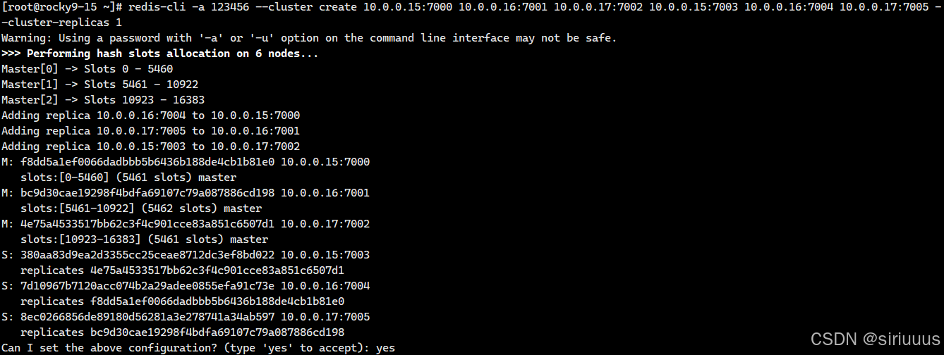redis-cli -a 123456 --cluster create 10.0.0.15:7000 10.0.0.16:7001 10.0.0.17:7002 10.0.0.15:7003 10.0.0.16:7004 10.0.0.17:7005--cluster-replicas 1