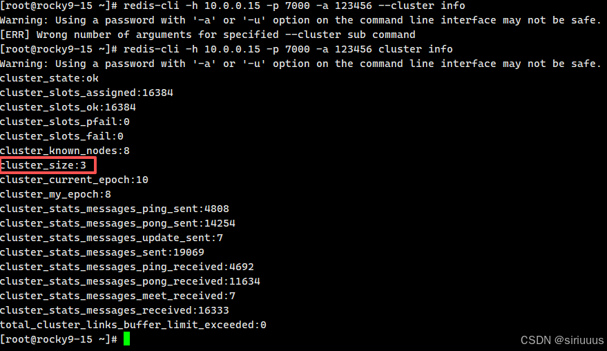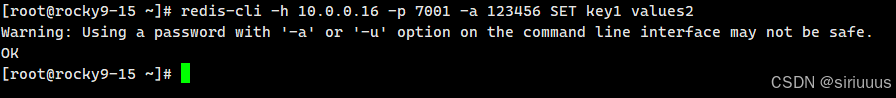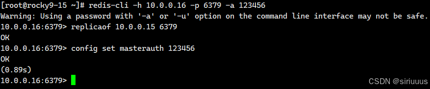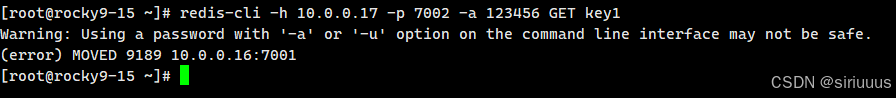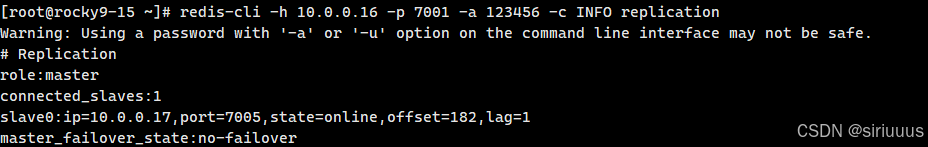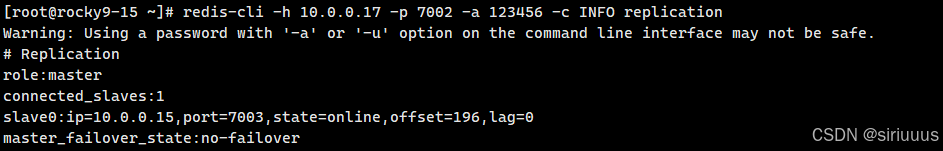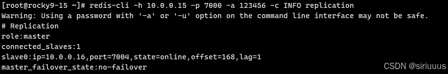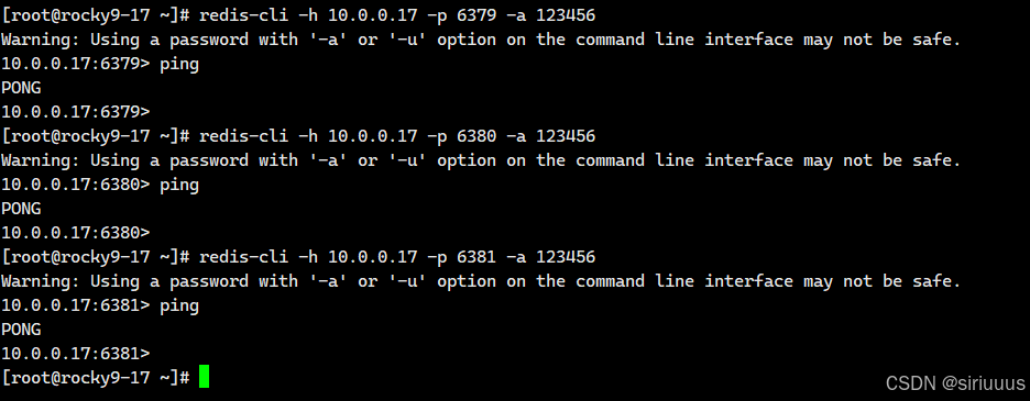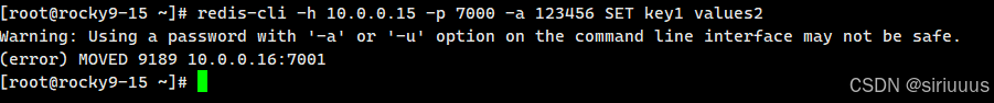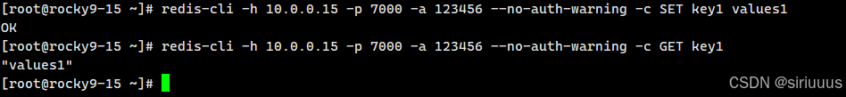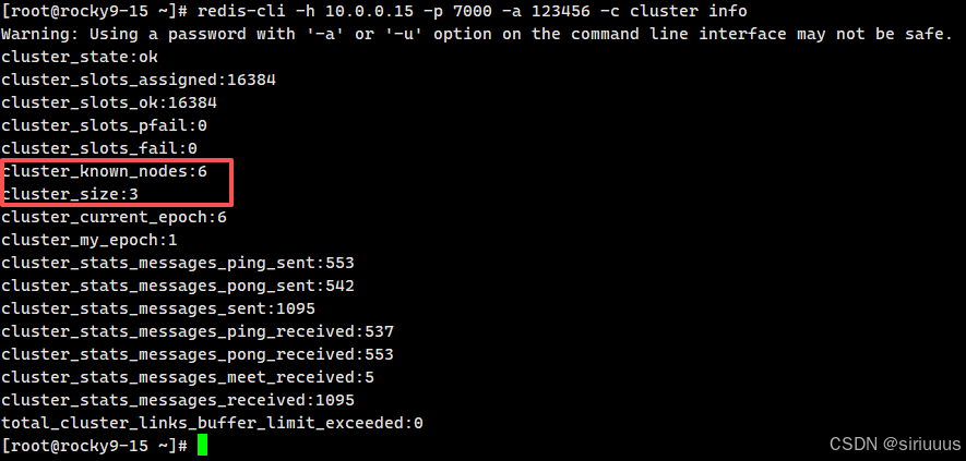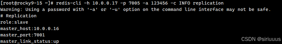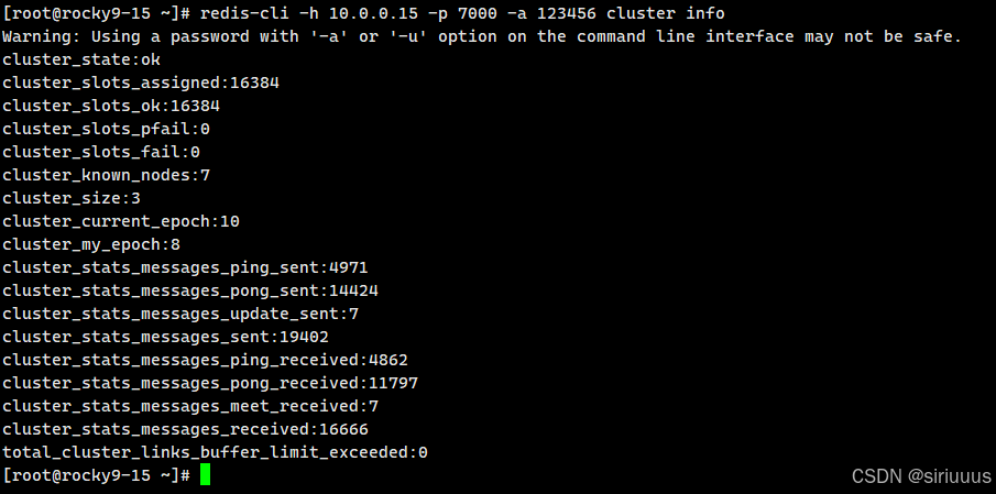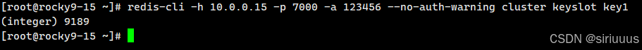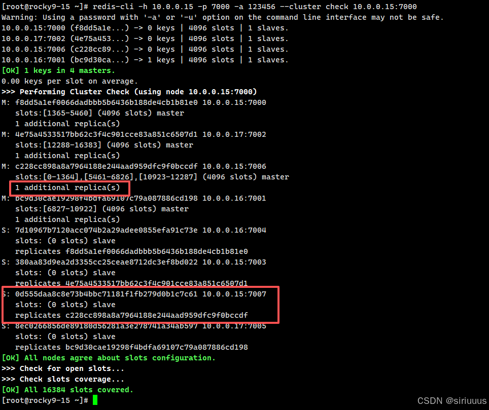 redis-cli -a 123456 --cluster create 10.0.0.15:7000 10.0.0.16:7001 10.0.0.17:7002 10.0.0.15:7003 10.0.0.16:7004 10.0.0.17:7005--cluster-replicas 1