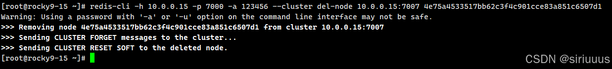 redis-cli -h 10.0.0.15 -p 7000 -a 123456 --cluster del-node 10.0.0.15:7007 4e75a4533517bb62c3f4c901cce83a851c6507d1