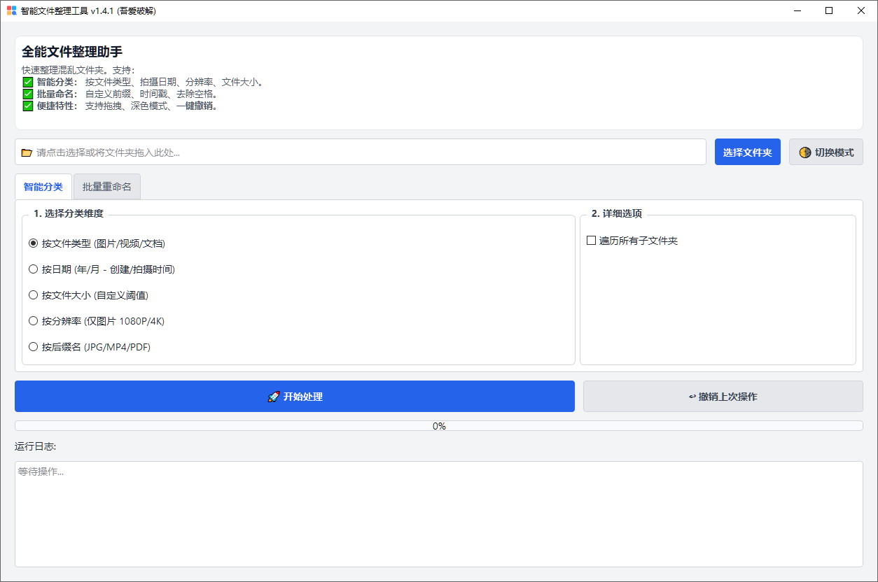 拖拽支持是工具的一大亮点,用户可直接从资源管理器或访达拖拽文件夹至软件窗口,系统会自动识别路径并进行预扫描。选中文件夹后,日志区会实时显示目录下的文件数量,让用户对整理规模心中有数。