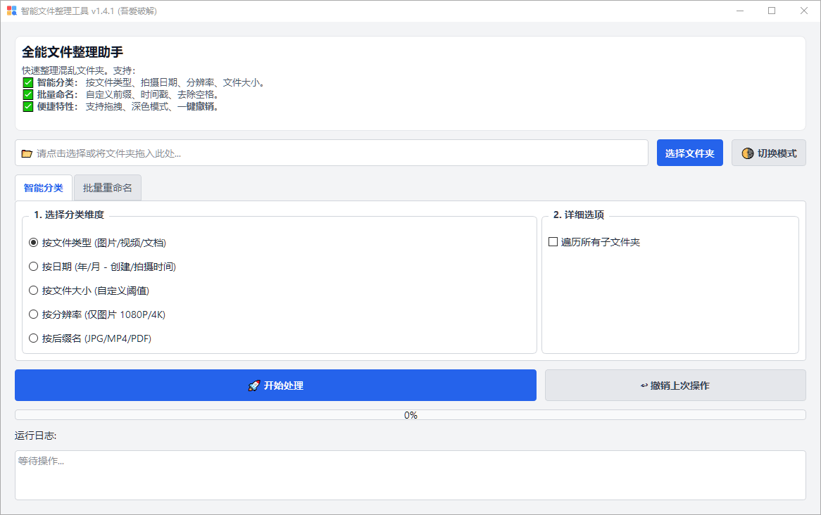 这款工具主打智能分类与批量重命名两大核心功能,同时融入拖拽操作、深色模式、一键撤销等便捷特性,让文件整理过程既直观又安全,即使是电脑新手也能快速上手。