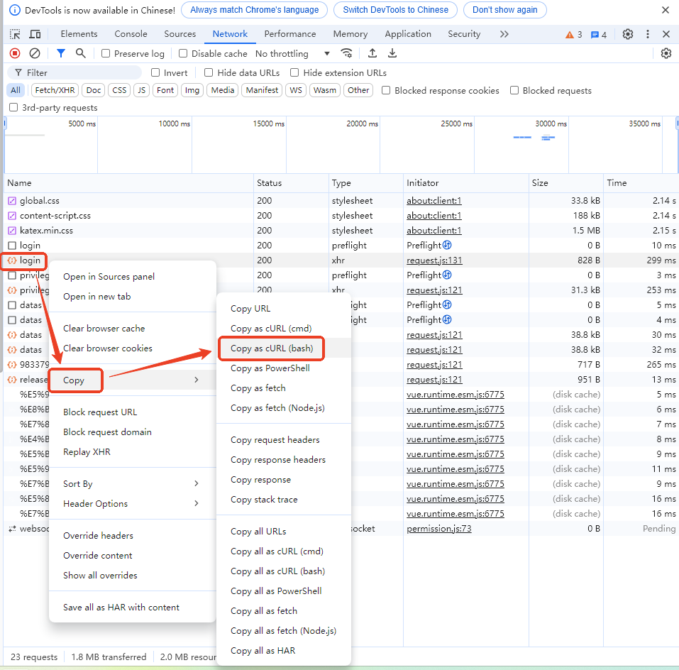**第一步:**我使用F12抓取一个登录接口的包,然后直接右键复制这个接口,操作如下图: