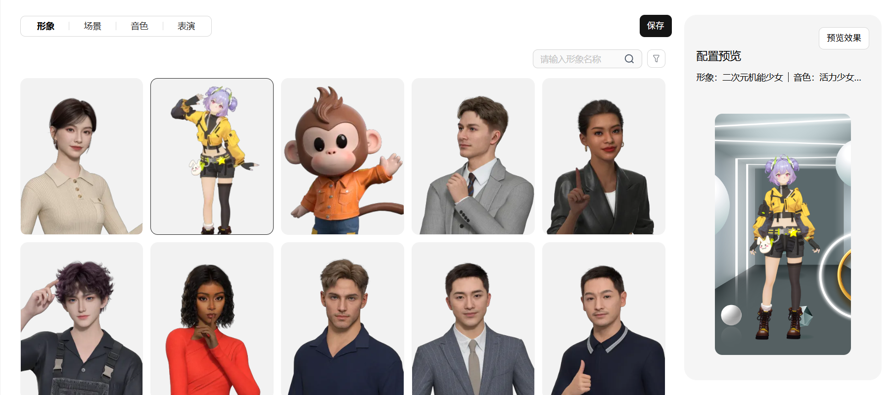 多风格:覆盖超写实、二次元、卡通、美型等多种角色风格和人设,可根据不同场景灵活选择适配的数字人形象,适配多样化需求。