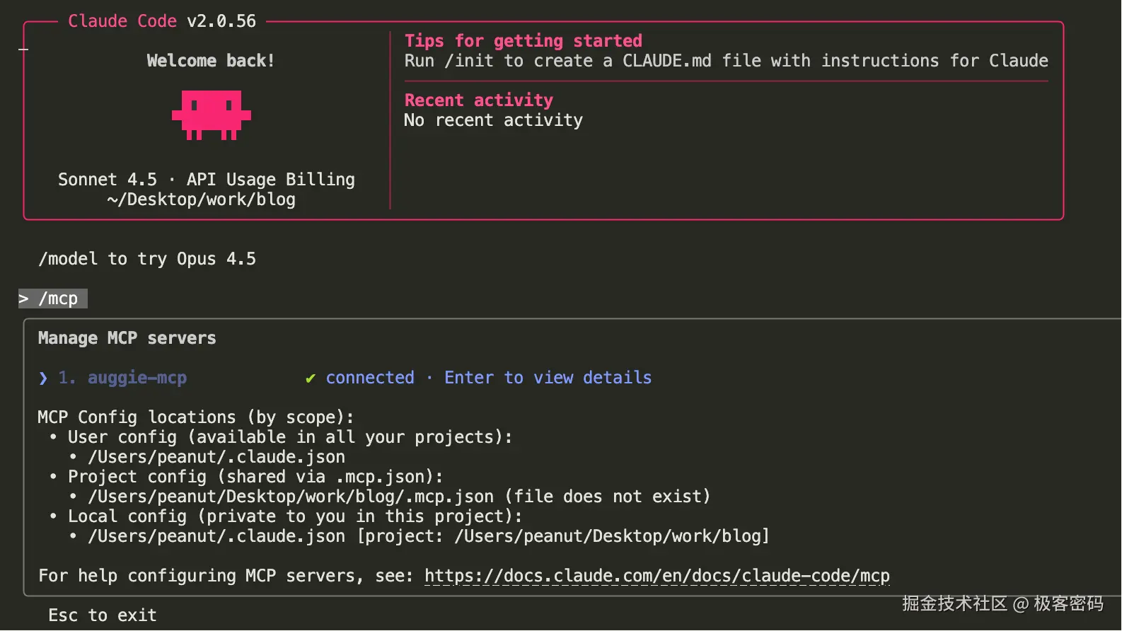 接下来运行 claude,输入 /mcp 指令查看 mcp 服务器是否配置成功