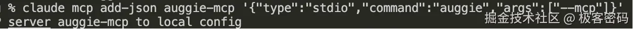 claude mcp add-json auggie-mcp '{"type":"stdio","command":"auggie","args":["--mcp"]}'