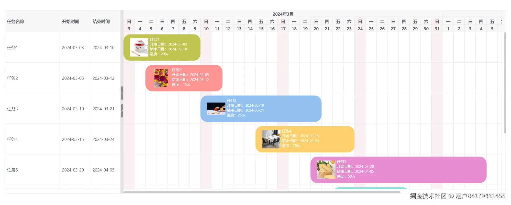{ id: 10001, title: '任务1', start: '2024-03-03', end: '2024-03-10', progress: 20, bgColor: '#c1c452', imgUrl: 'https://vxeui.com/resource/productImg/product9.png' },