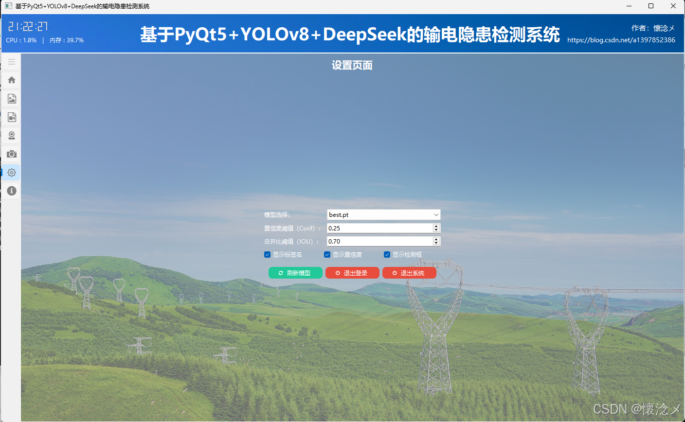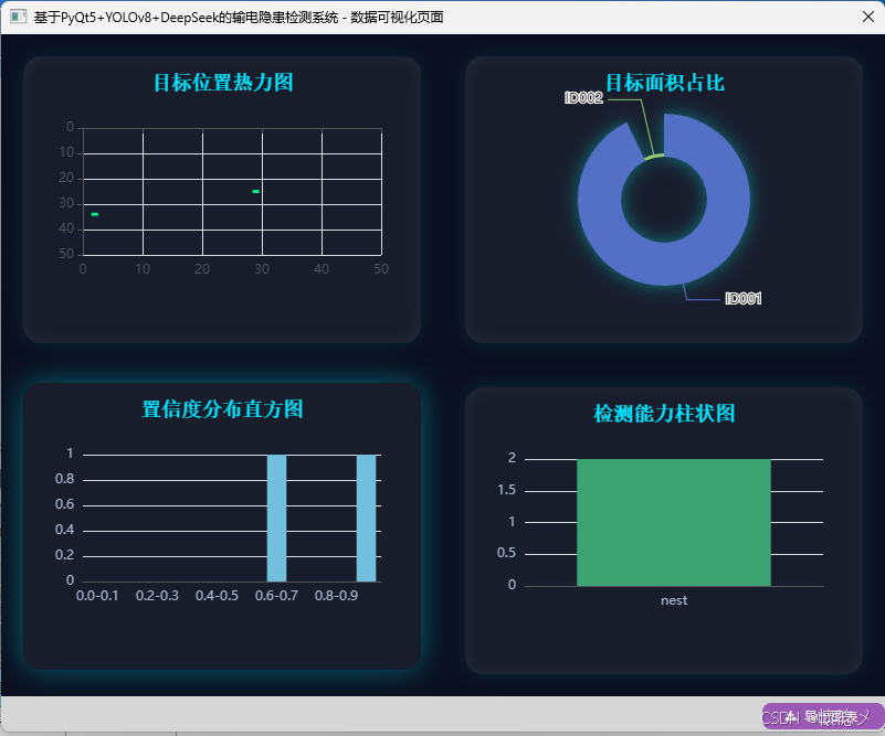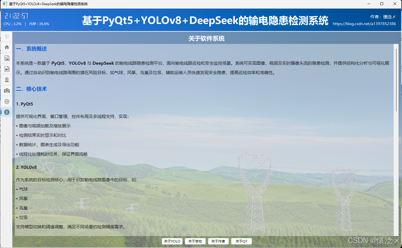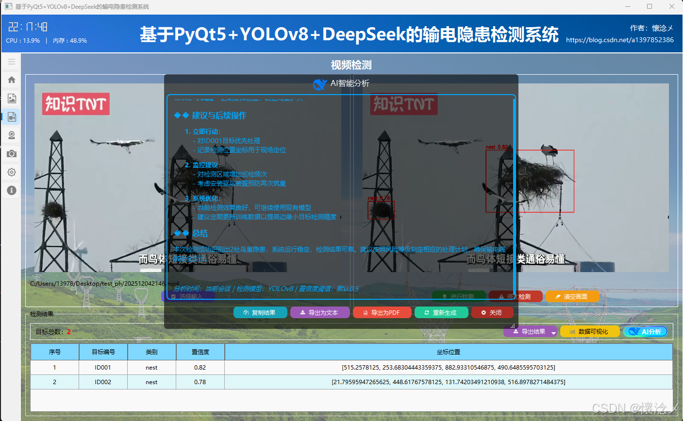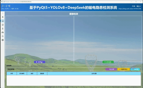 本次给大家介绍了我使用PyQt5+YOLOv8+DeepSeek的输电隐患检测系统,本系统功能强大,支持多种数据源输入,包含多种用户交互按钮以及模式,内置数据可视化方案、大模型AI加持,是您学习、工作使用的不错选择!