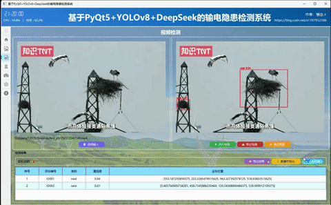 本项目基于 PyQt5 构建可视化操作界面,结合 YOLOv8 的目标检测能力以及 DeepSeek 的图像检索与定位功能,实现对输电线路潜在危险物体的自动识别与报警。通过实时检测鸟巢、气球、风筝和垃圾,系统可以: