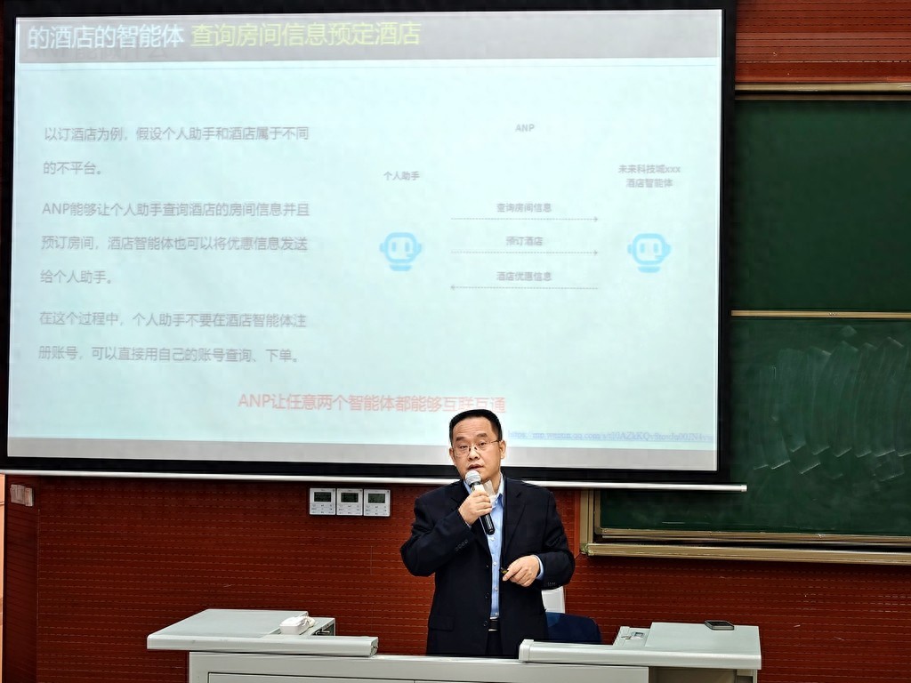 在专题报告中,叶毓睿研究员围绕"智能体的核心特征---技术体系---产业趋势"展开系统阐述。他从自主决策、任务分解、长期记忆、多模态能力等关键能力出发,深入解析了智能体的技术架构与运行机制,并结合大模型、算力架构、行业应用案例等内容,展示了智能体在教育、科研、产业服务、城市治理等领域的典型实践。报告内容深刻、见解独到,带给现场师生强烈的前沿冲击。