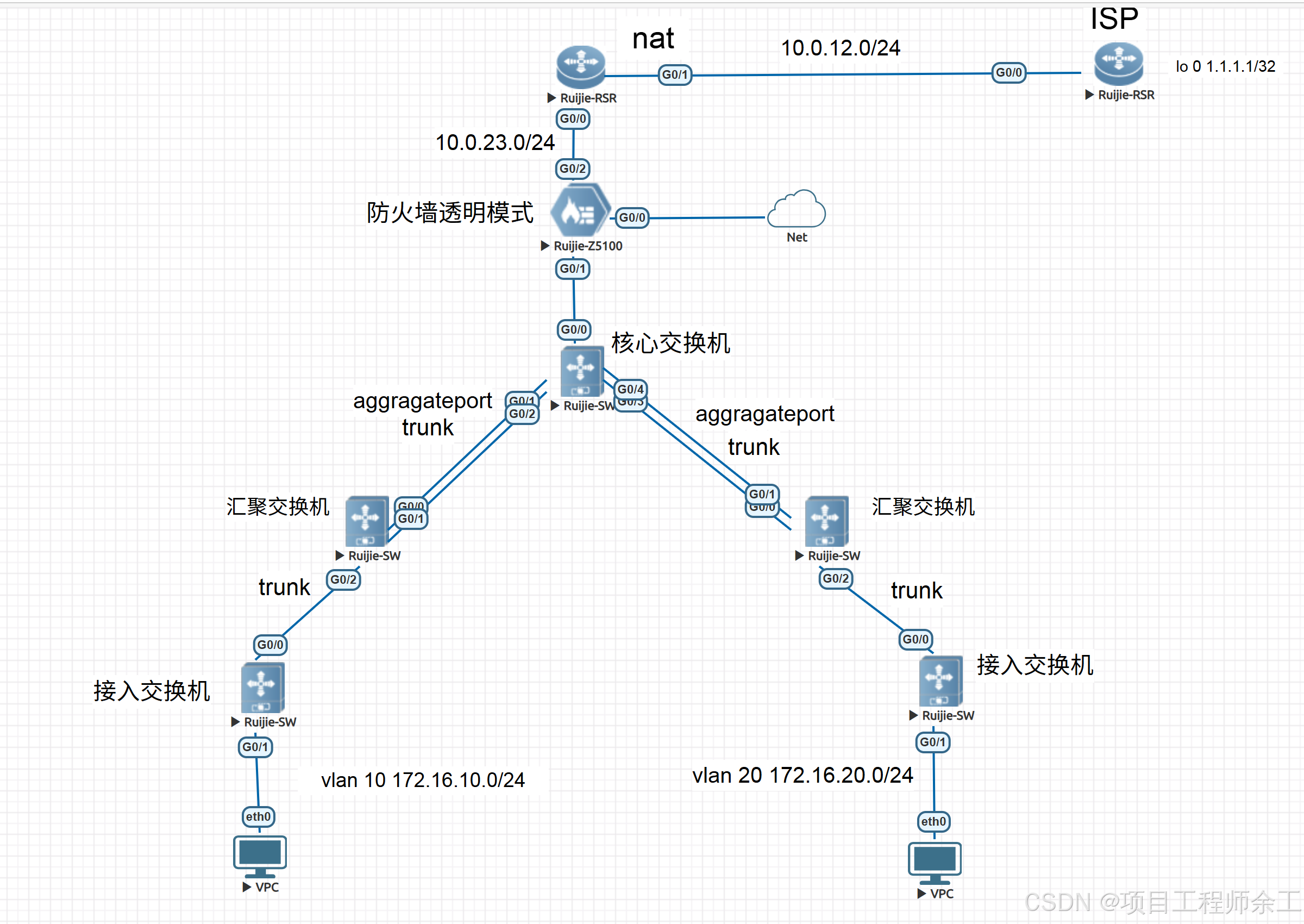3、核心上ospf配静默接口,和汇聚用聚合跑trunk
