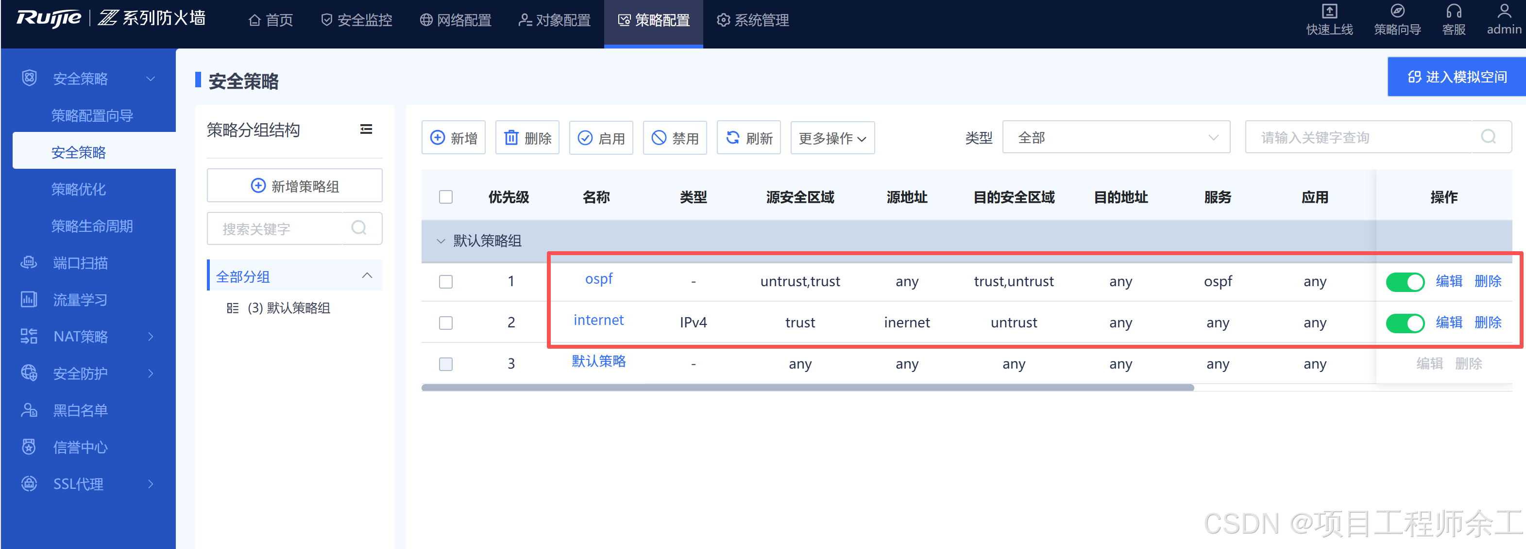 测试发现和华为防火墙一样ospf策略也是默认放行的