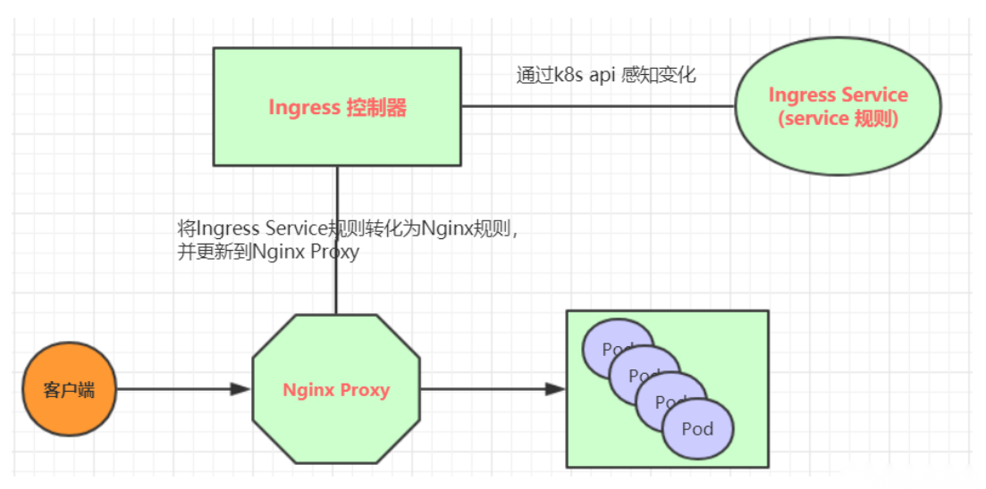 Ingress控制器动态感知 Ingress服务规则的变化,然后生成一段对应的Nginx反向代理配置