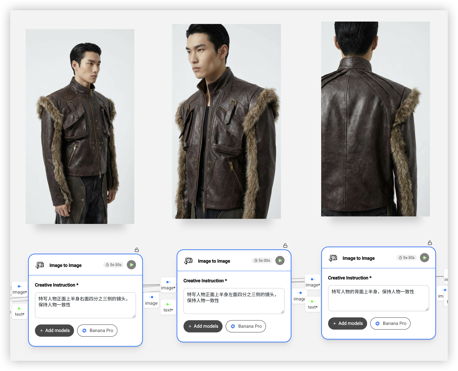 每个节点都会继承前面生成出的基础上身图或中间结果,使用同一份人物设定来保持脸和身材的一致,同时针对各自角度添加不同的机位说明。最终一次运行就能得到一整组风格统一、角度多样的上身图,你只需要在结果里挑出最适合放详情页和主图的那几张。