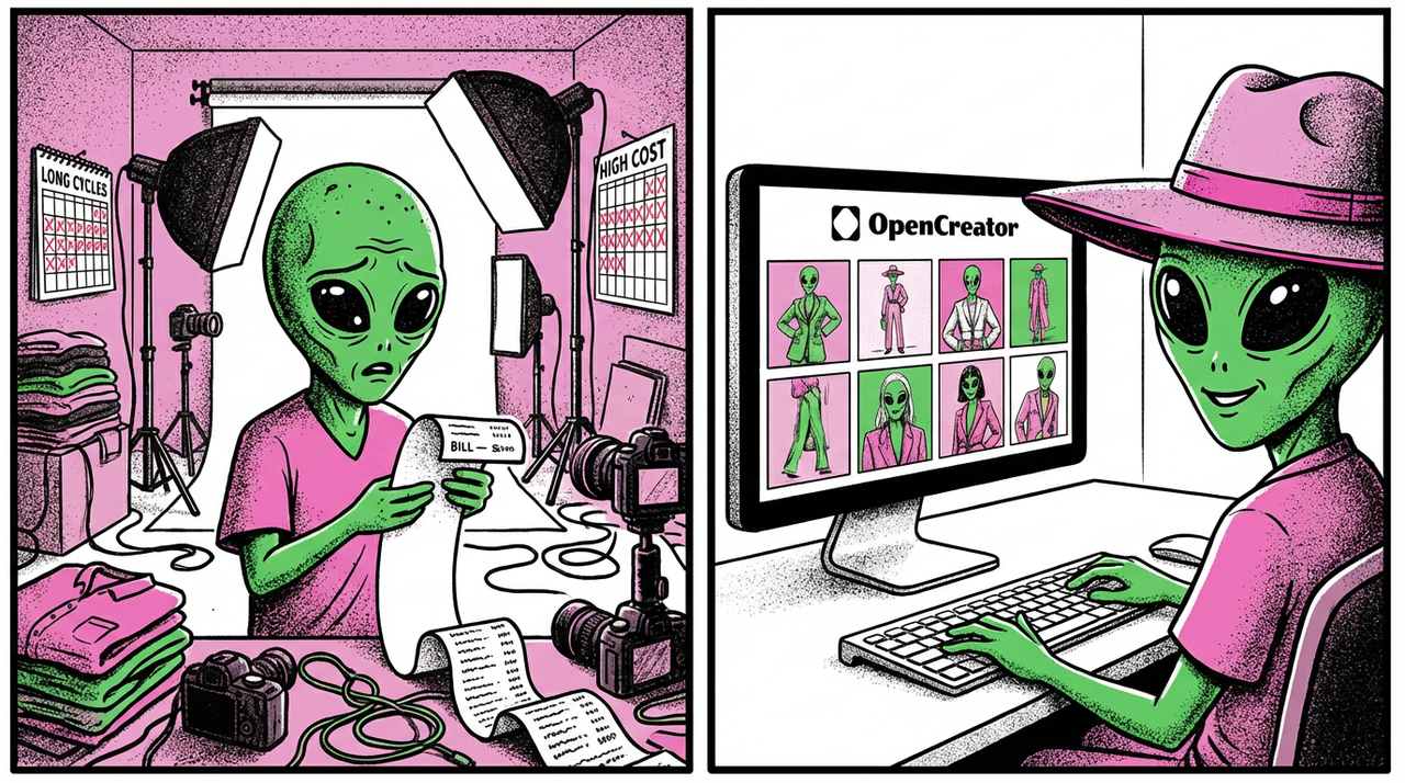 如果用 AI 生成方案,在熟练掌握工作流之后,单个 SKU 从素材准备到生成多张上身图,大致在 5--10 分钟。100 个 SKU 的工作量,一个人 2--3 天可以跑完,中间还可以边看边调。以 OpenCreator 为例,使用 Banana Pro 等图像模型每次会消耗一定的 Credits,一组多角度上身图的成本通常在每款几元到十几元的量级。加上操作人力成本,相对于传统拍摄属于更可控、可按需扩缩的一种方式。