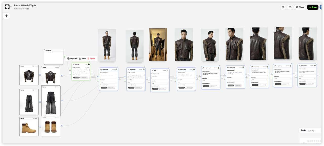 市面上已经有不少工具可以实现虚拟试穿效果,包括偏「一键生成」的 SaaS,也包括像 OpenCreator、ComfyUI 这种基于工作流的创作平台。这里我以 OpenCreator 的一个「批量 AI 模特试穿」工作流为例来讲原理,你也可以类比到其他支持图生图的工具上。