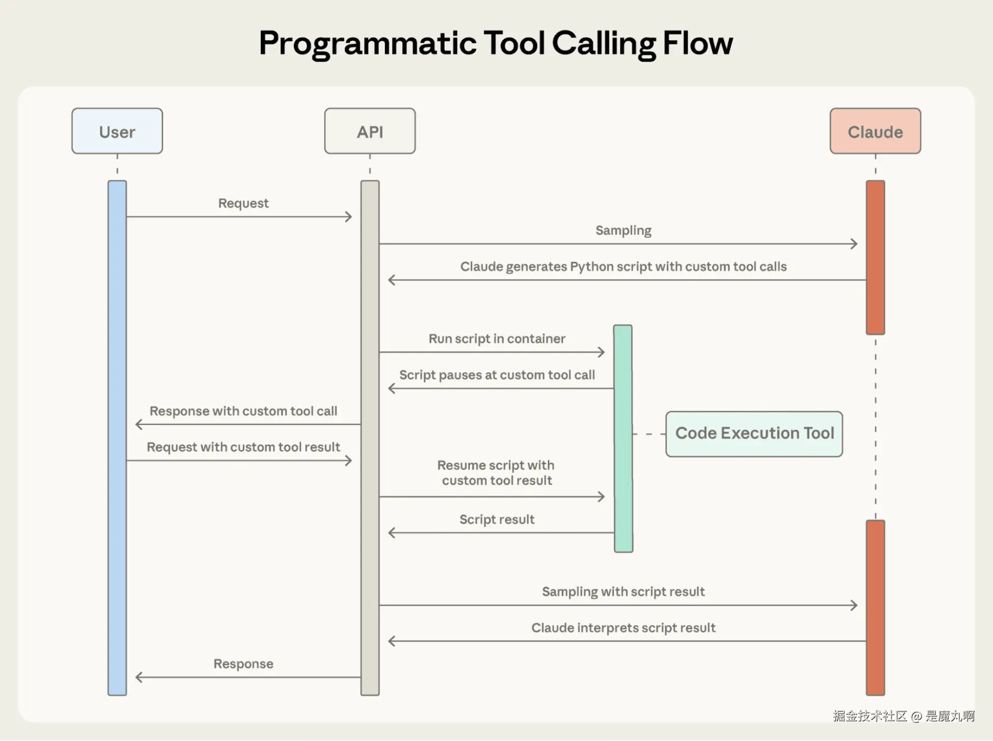 每个工具结果不是返回到 Claude,Claude 编写编排整个工作流的 Python 脚本。脚本在代码执行工具(沙盒环境)中运行,当需要来自您的工具的结果时暂停。当您通过 API 返回工具结果时,它们由脚本处理,而不是由模型消费。脚本继续执行,Claude 只看到最终输出。