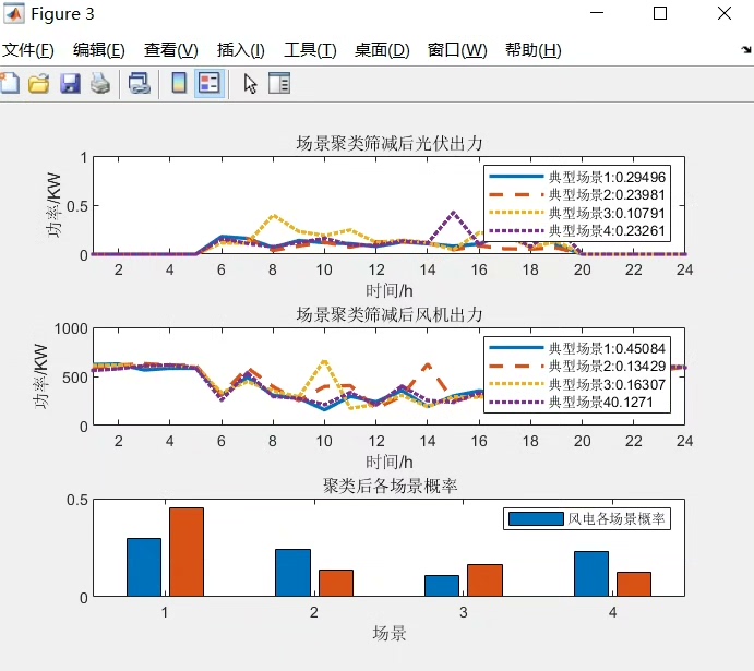 这个程序运行得相当稳定,仿真结果也很直观。从截图中可以清晰地看到生成的风光场景以及经过削减后得到的五个场景,每个场景还有对应的概率显示。