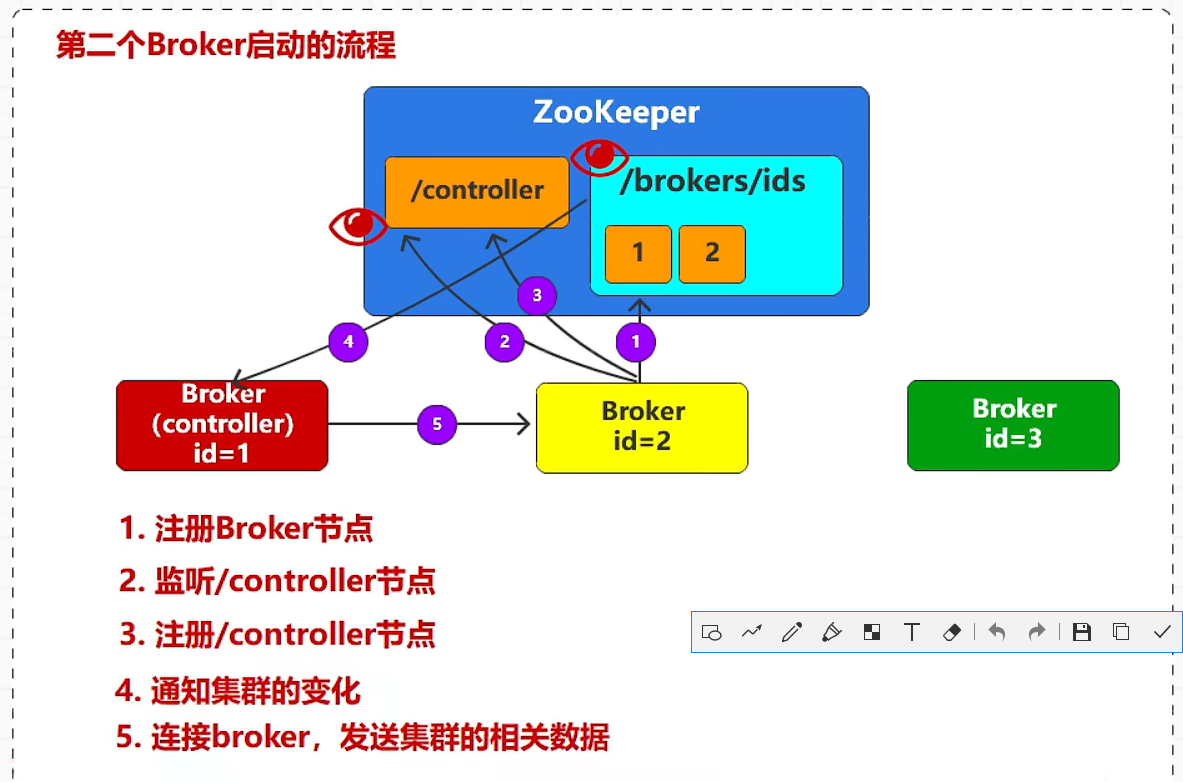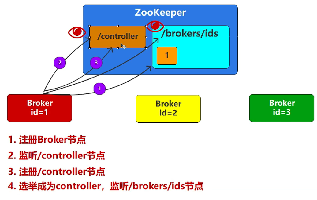 - Zookeeper中没有任何节点,此时启动第一个Broker,ZK当中创建第一个节点,id=1;成为集群的管理者;