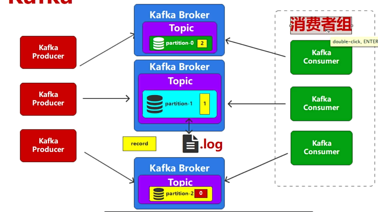 - 所以消费的时候,要将消费同一个Topic的多个消费者组成1个消费者组(整体)