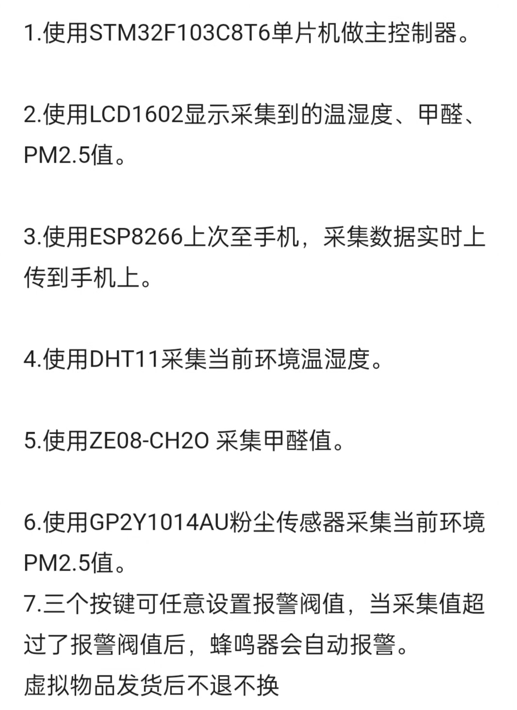 基于STM32的温湿度、甲醛、PM2.5空气质量检测系统采集设计资料,联系赠送答辩模板等全套资料。 主要功能: 使用STM32为主控制器,可采集当前环境下的温湿度、甲醛、PM2.5值,当采集值超过预设阀值时,蜂鸣器自动报警。 采集到的温湿度、甲醛、PM2.5会显示在LCD1602显示屏上,且自动上传至上位机(手机),可以在手机查收采集到的各种参数。 可通过三个按键任意设置报警阀值。 功能在图1,具体内容图2,实物图3 注意事项: [1]由于资料包的特殊性 [2]单片机采用STM32,不改别的单片机 [3]APP不支持修改